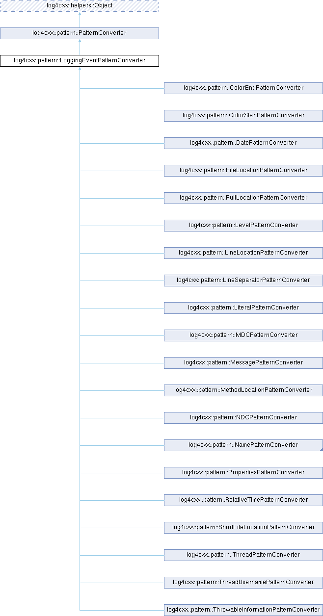 Implemented in log4cxx::pattern::ClassNamePatternConverter, log4cxx::pattern::ColorEndPatternConverter, log4cxx::pattern::ColorStartPatternConverter, log4cxx::pattern::DatePatternConverter, log4cxx::pattern::FileLocationPatternConverter, log4cxx::pattern::FullLocationPatternConverter, log4cxx::pattern::LevelPatternConverter, log4cxx::pattern::LineLocationPatternConverter, log4cxx::pattern::LineSeparatorPatternConverter, log4cxx::pattern::LiteralPatternConverter, log4cxx::pattern::LoggerPatternConverter, log4cxx::pattern::MDCPatternConverter, log4cxx::pattern::MessagePatternConverter, log4cxx::pattern::MethodLocationPatternConverter, log4cxx::pattern::NDCPatternConverter, log4cxx::pattern::PropertiesPatternConverter, log4cxx::pattern::RelativeTimePatternConverter, log4cxx::pattern::ShortFileLocationPatternConverter, log4cxx::pattern::ThreadPatternConverter, log4cxx::pattern::ThreadUsernamePatternConverter, and log4cxx::pattern::ThrowableInformationPatternConverter.